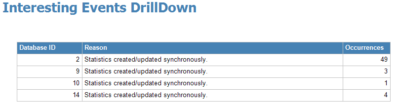 Source “sqlnexus.rds” so that the database context can switch when you change the database name using the drop-down menu in the SQL Nexus tool. Then I created an Action Event to jump to a child report which is called “Event Drilldown.rdlc”. This gives you a view as shown in the screenshot below. This is showing you a on which database the AutoStats event was fired and what the reason for AutoStats kicking in.