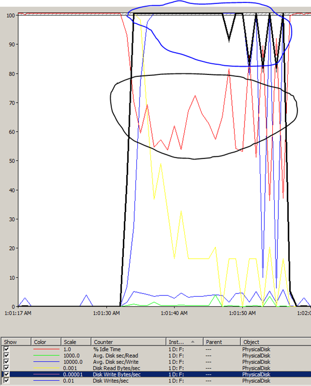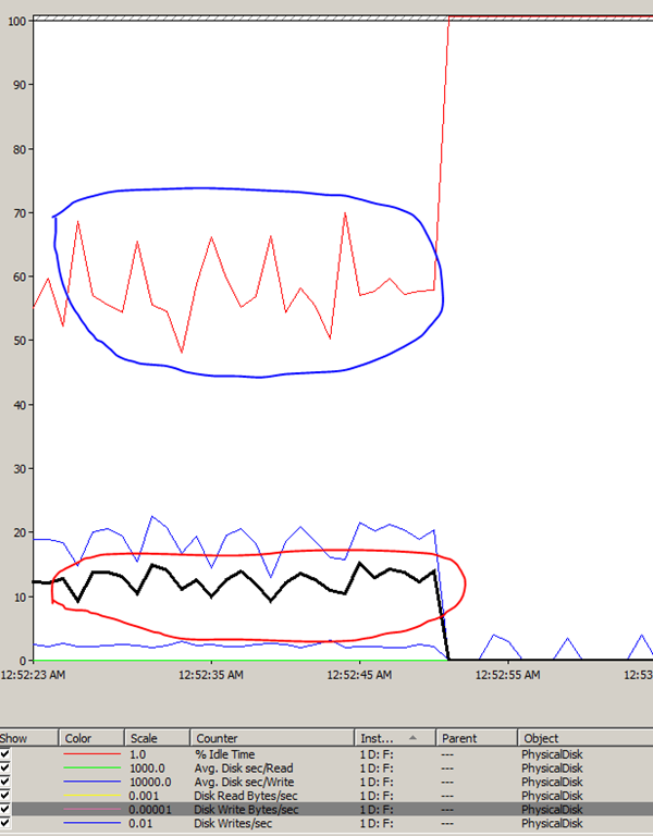 If you look at the Performance Monitor graphs for the disk statistics that I captured for a single run for Test 1 (screenshot above) and Test 2 (screenshot on the left), you will see that the %Idle Time for the disk, on which the database files resided on (in my case F: drive), shows was busy 50% of the time (see blue squiggly above) during the test and the value climbed back to ~100% after the test completed. On the contrary, the %Idle Time for the same disk has a very zig-zag pattern (see black squiggly on left) during Test 2 which indicates that the disk was sporadically busy and it was not a continuous pattern as observed in Test 1.