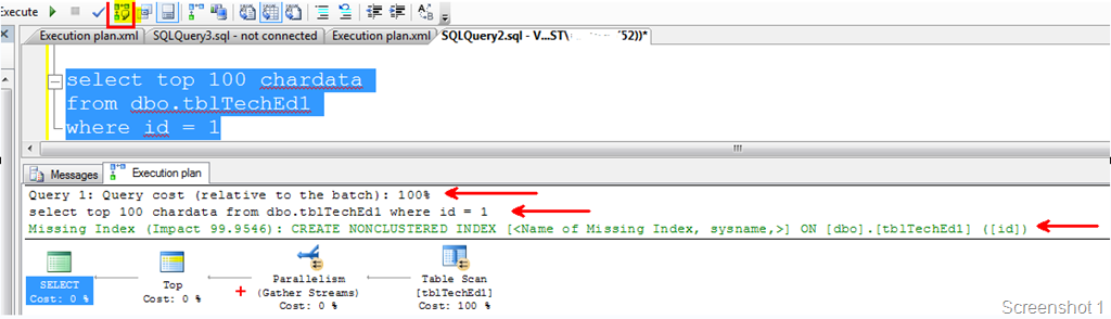 The button (see red square in Screenshot 1) on the toolbar in Management Studio is the “Display Actual Execution Plan” option which allows you to show estimated execution plan. There are three important things that you can ascertain right off the bat using the execution plan tab (which are denoted by the red arrows in Screenshot 1):