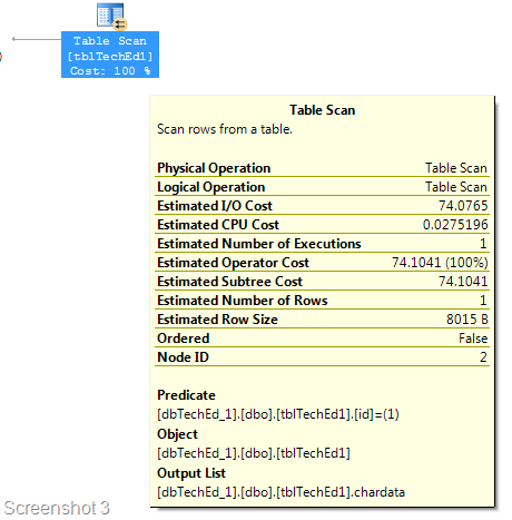 By clicking on each of the operators, you can see the properties of the query plan operator which is highlight. If you look into Screenshot 3, you will see that the Table Scan operator properties are being displayed where in you can determine the Estimated Number of Rows that will be returned along with the Estimated I/O and CPU cost of the query.