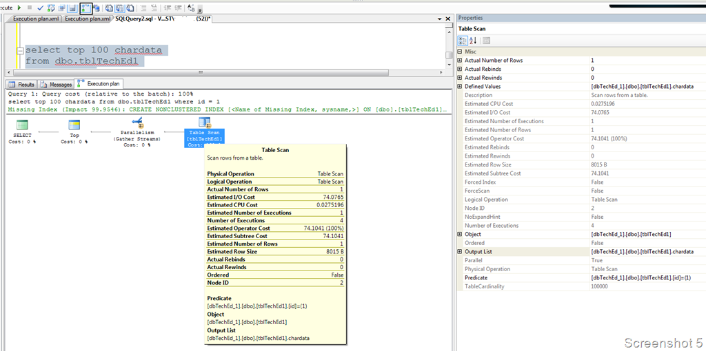 If you now look at Screenshot 5, you will see that the black square denotes the “Include Actual Execution Plan” option. Once the Query Execution is complete, the execution plan will appear in the Execution Plan tab. The above points mentioned about the Estimated Plan shown in Management Studio in the graphical format still applies to the actual execution plan. However the big difference in the execution plan is the Actuals (Rebinds, Rewinds, Number of Rows) which are reported along with the Estimates. See the properties window and the mouse over operator properties in Screenshot 5. If there is a big mismatch between the actual number of rows & executions as compared to the estimates, then there is a change that the cardinality estimates were wrong due to outdated statistics or lack of the same!