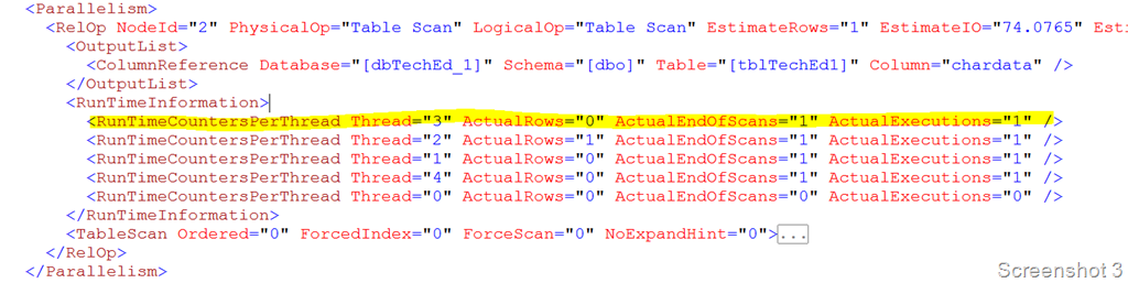 The next difference that you will notice in the actual execution plan is the runtime information which will be enclosed with the RunTimeInformation tags. As you can see in Screenshot 4, you will notice that the RunTimeInformation has the actual number of rows and actual executions for each parallel thread. If it was a serial execution, then you will have the runtime statistics for Thread ID 0.