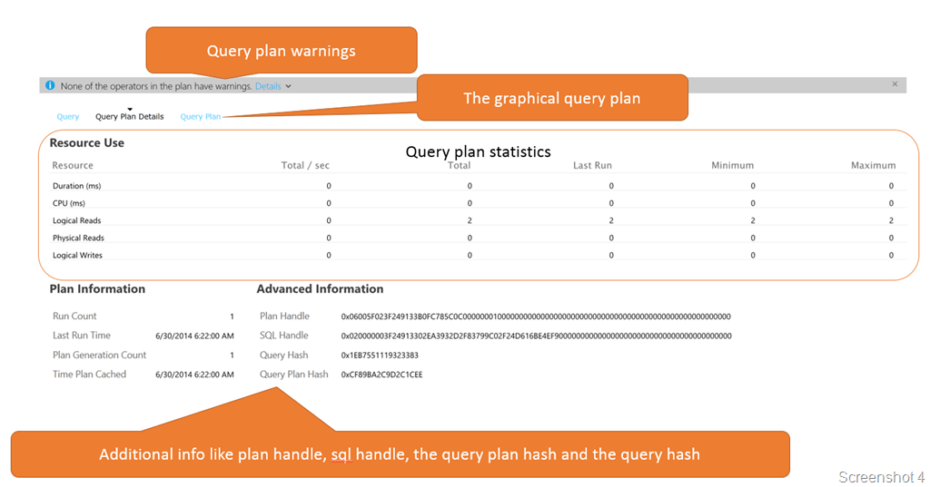 The Query Plan Details view which is the default view when you click on a query in the Query Performance tab shows your various kinds of information. You get a table showing the resource usage w.r.t. the reads, execution count, writes, minimum and maximum values. This output is derived from the sys.dm_exe_query_stats DMV. Then you get additional information like the time when the plan was cached, plan handle and sql handle. If you want to find out similar queries and plans in the cache, then you also get the query hash and query plan hash.