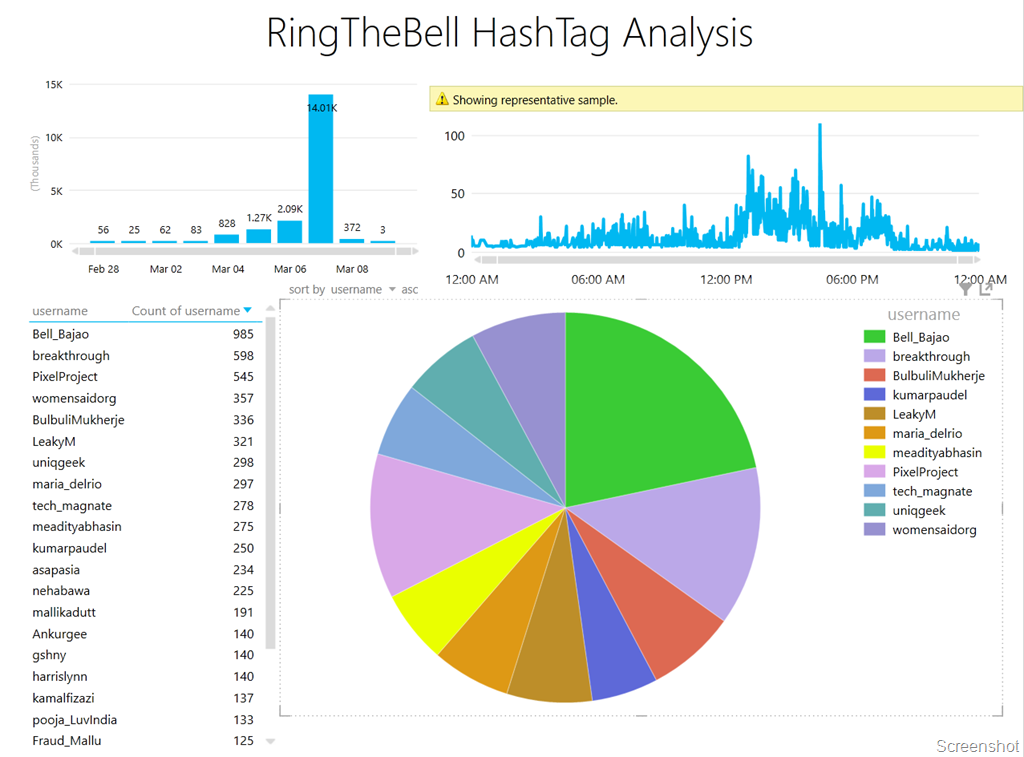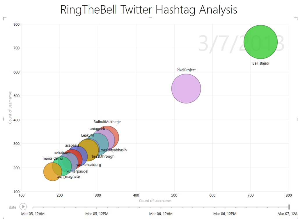 The video below shows the interactivity features of the Power View report in Excel. What you can do with such rich visualizations are endless. Just by looking at certain visual representations, it is easy to draw interesting conclusions. For example, the timeline shows me that the Bell_Bajao and PixelProject twitter handles were extremely active on the day of the event. There were others who were more silent in the days running upto the event and then started live tweeting/re-tweeting throughout the event. The TOP 5 contributors on the day of the event had a major pie of the tweets that were shared on 7th March. Within a very short time, I was able to decipher trends which would have taken me a while to dig out using traditional analysis methods!