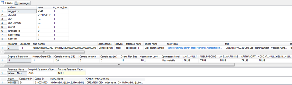 So… Let’s begin the fun… This time around, I shall use a stored procedure to demonstrate the benefit of generating plans from the plan cache and shredding them. You could use sys.dm_exec_query_stats to get various runtime statistics for the cached plans in the SQL Server procedure cache. However, the compilation statistics is something that needs to be fetched from the XML plan itself. If you are interested in the SET options, then these are available from the ouptut of the sys.dm_exec_plan_attributes function.