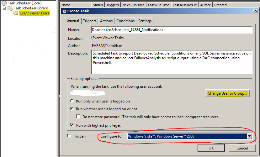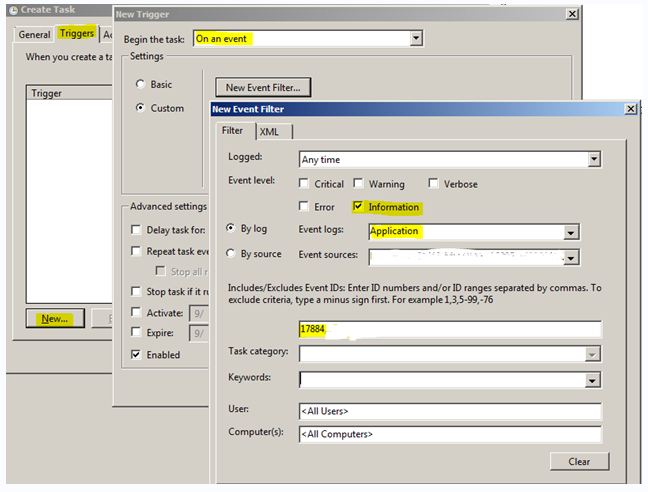 The next thing that is needed to be done is create Task Scheduler task to execute the Powershell script above when a 17884 condition is reported.
