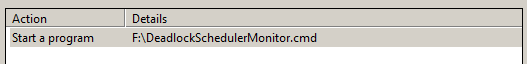 3. Under the Actions tab, click on New. Select Start a Program from the Action drop-down box. In the Program/script text box, provide Powershell.exe. In the Add arguments (optional) text box, provide the following: -File “F:\DeadlockSchedulerMonitor.ps1”. Or you can choose to provide a .cmd file path whose contents are “Powershell.exe -File “F:\DeadlockSchedulerMonitor.ps1” > F:\DeadlockSchedulerMonitorLog.txt”. I went with the second option. F: drive root is where my .ps1 script and .cmd file are present. You would need to modify this accordingly depending on where your script is. Once that is done, your action tab should be similar to the screenshot below.