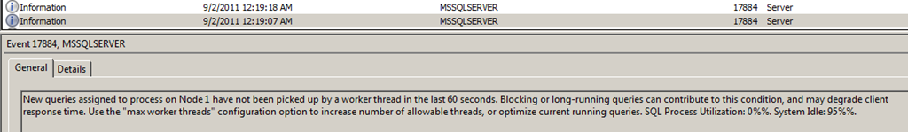 The second part of the script reads the Application event log for the first occurrence of an informational message with the text substring “have not been picked up by a worker thread in the last 60 seconds” from any SQL Server instance as the source.